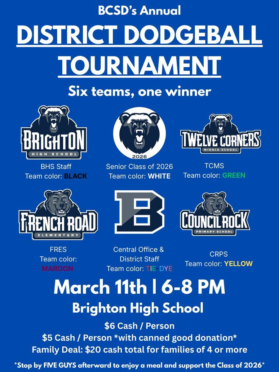 The annual District Dodgeball Tournament will be held from 6 to 8 p.m. Wednesday, March 11 in the Brighton High School gym. Admission is $6 or $5 with a canned good. Families of four or more can en...